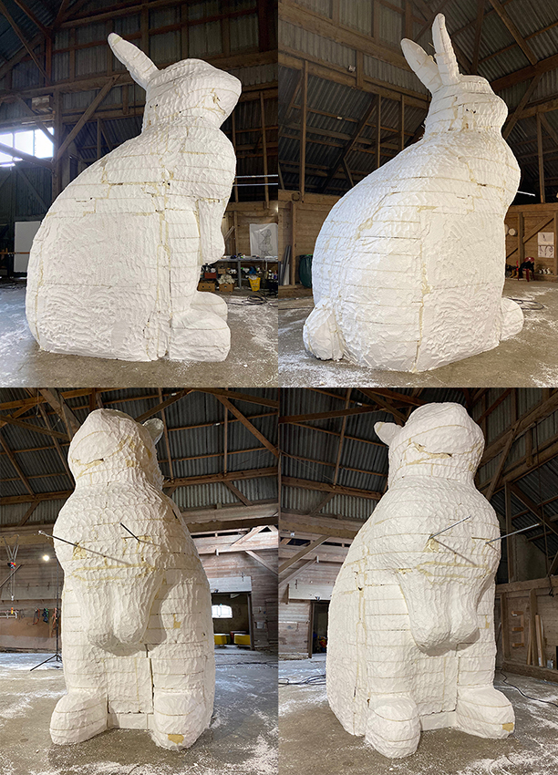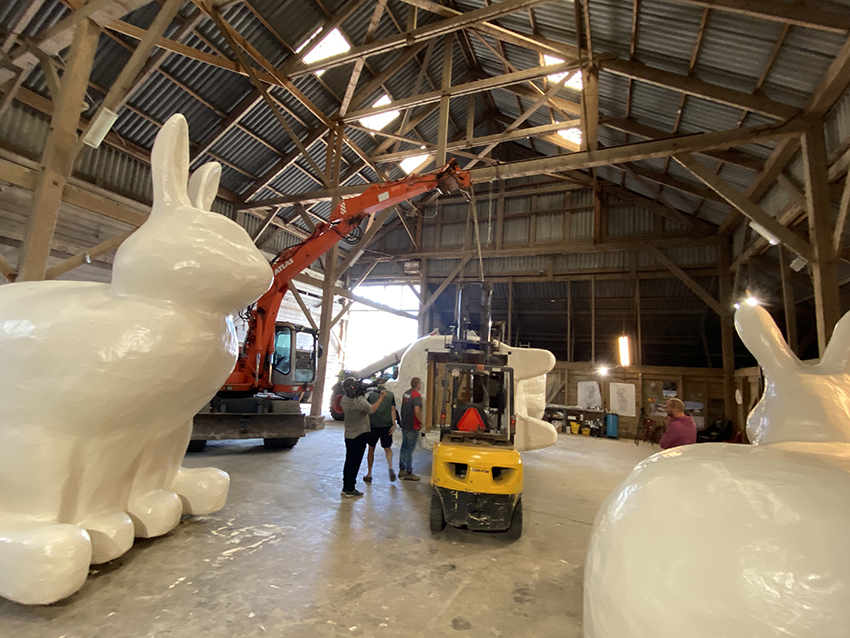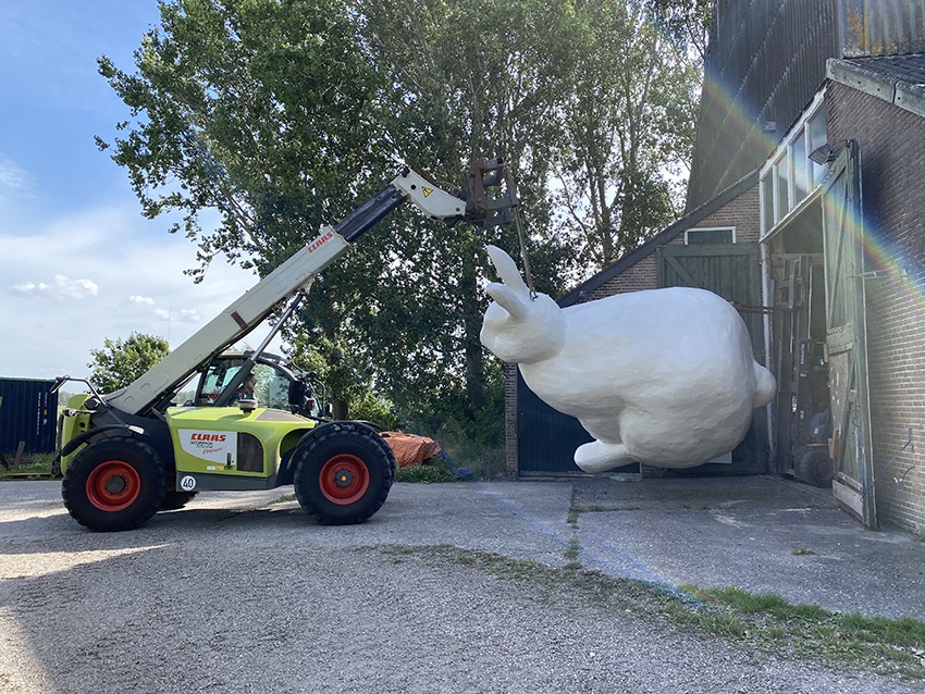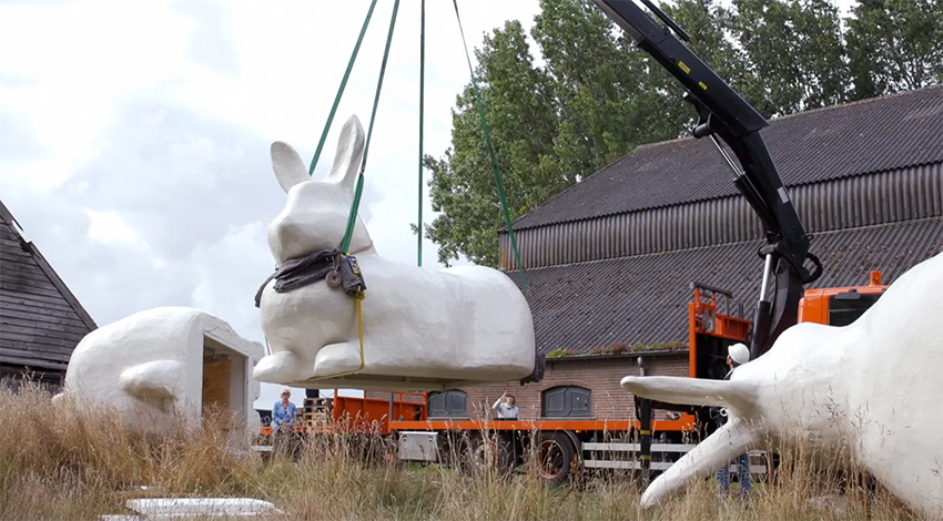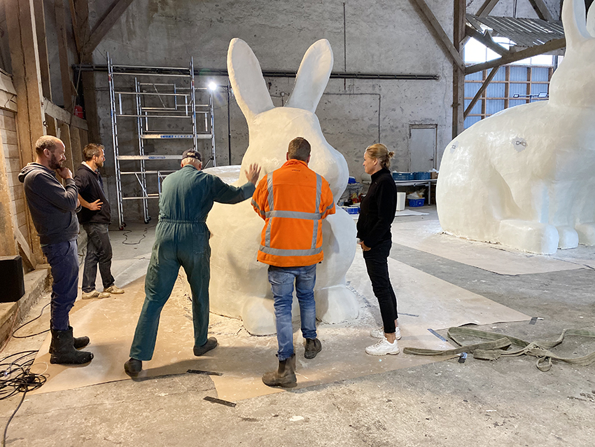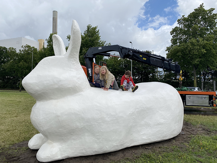 Opdracht voor het ontwerpen en uitvoeren van blow ups van drie konijnen. Een liggend, zittend en staand konijn. Konijnen als zachte tegenhangers van industrie en staal.